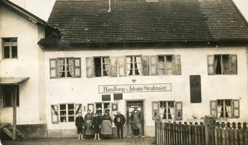 Um 1888 kaufte Johann Stieglmaier (1877-1928) das Anwesen mit der Hausnr. 15 1/5, heute Marktstraße 16, und führte ein Lebensmittelgeschäft mit Getreideannahme. Das etwa 1928 fotografierte Anwesen der Handlung Stieglmaier zeigt die Besitzer. Eine schwarze Tafel wirbt für das Bankhaus Kratzer & Co. in Friedberg,[10] das ihre regelmäßigen Sprechstunden in dem Geschäft anbot.[11] Sein Sohn Johann (1913-1942) führte das Geschäft weiter. Dessen Frau Magdalena arbeitete im Kolonialwarenladen mit, aber auch im Lagerhaus, wo Getreide, Dünge- und Spritzmittel verkauft wurden. Nach dem Tod ihres Mannes heiratete Magdalena Peter Kreitmaier (1904-1986) aus Puchschlagen, der den Getreidehandel mit Kunstdüngerverkauf bis 1976 übernahm. Im Haus war das öffentliche Telefon eingerichtet. Oftmals musste eine Nachricht an die Dorfbewohner persönlich überbracht werden. Aus dem Kolonialwarenladen wurde ein Gemischtwarenladen, in dem die ersten Einkaufswagen zur Selbstbedienung bereitstanden. Es gab fast alles an Lebensmittel und Gebrauchsartikel. Während in den 1960er Jahren nur eine Käsesorte, nämlich Emmentaler, angeboten wurde, erweiterte sich das Käseangebot über die Jahrzehnte auf etwa 100 Sorten.
